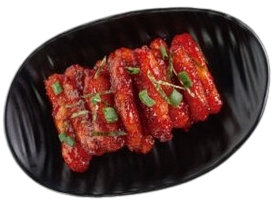 Receta de pollo frito extra crunchy con un toque de curry acompañado de tteok. Desarrollada en Corea y traída exclusivamente para Seoullo.