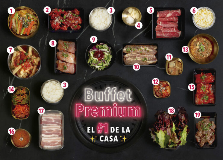 Incluye: Samgyeopsal natural y marinado en salsas de la casa (cerdo), además de todas las carnes de res como chadolbagi (cortes finos de res), bulgogi en nuestra salsa especial y L.A Galbi (costilla marinada). Disfruta de kimchi fries, queso para derretir, verduras para asar y KFC (Korean Fried Chicken).